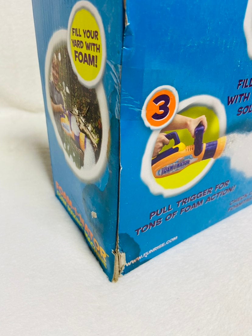 This fun foam gun is new in box. Add bubble solution and create a world of foaming bubbles. It comes in its original packaging. It had some bubble leaking on the package. Wonderful for play or display. It is long retired and no longer in production.