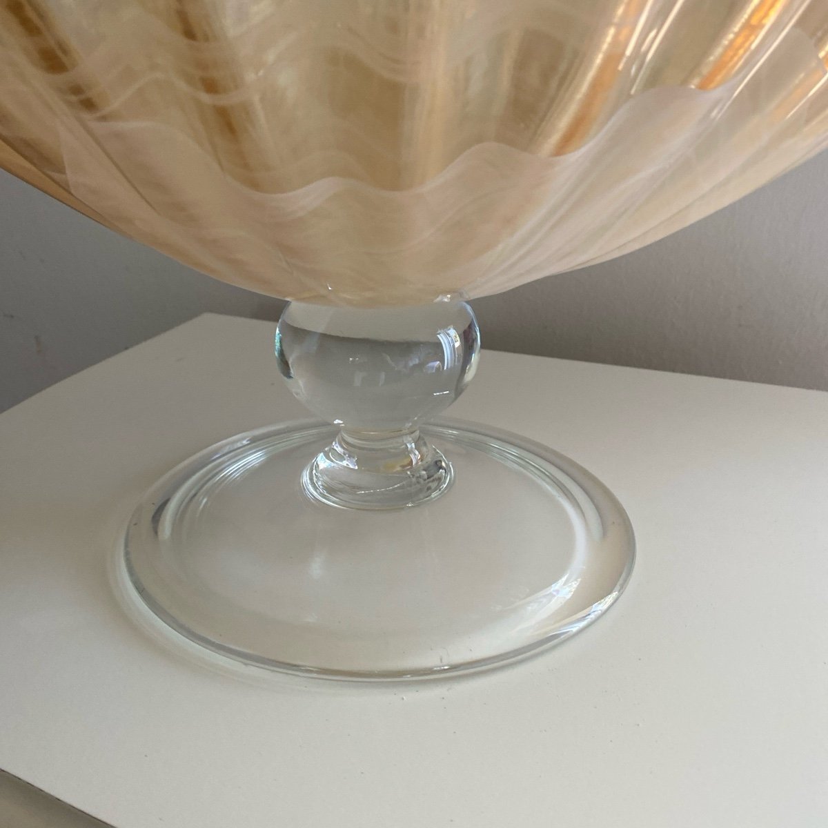 Magnificent footed centerpiece; gold/amber color with some marbling effect; iridescent on the inside; 14 1/2”H x 20” L x 11” W. Excellent vintage condition; no chips or cracks. Heavy.