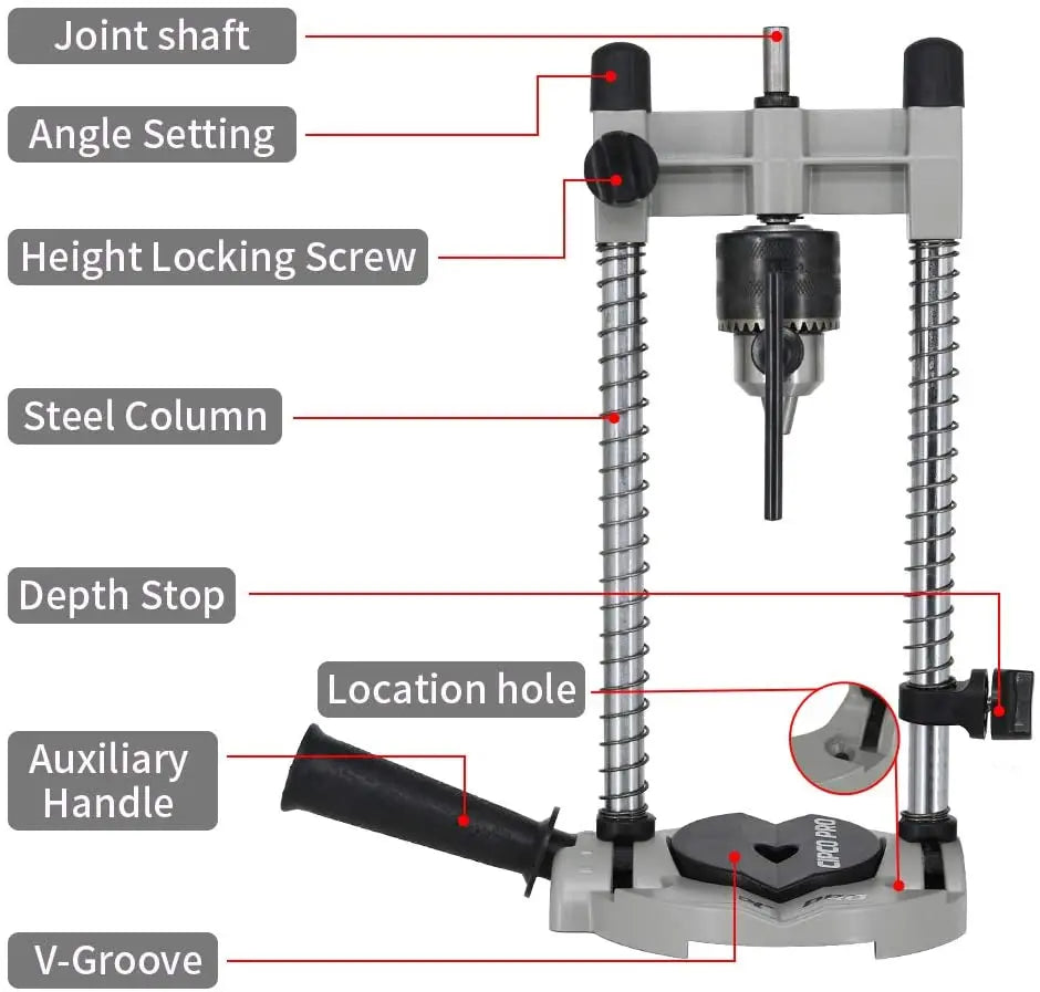 This drill guide can be used in horizontal, vertical or angle positions.