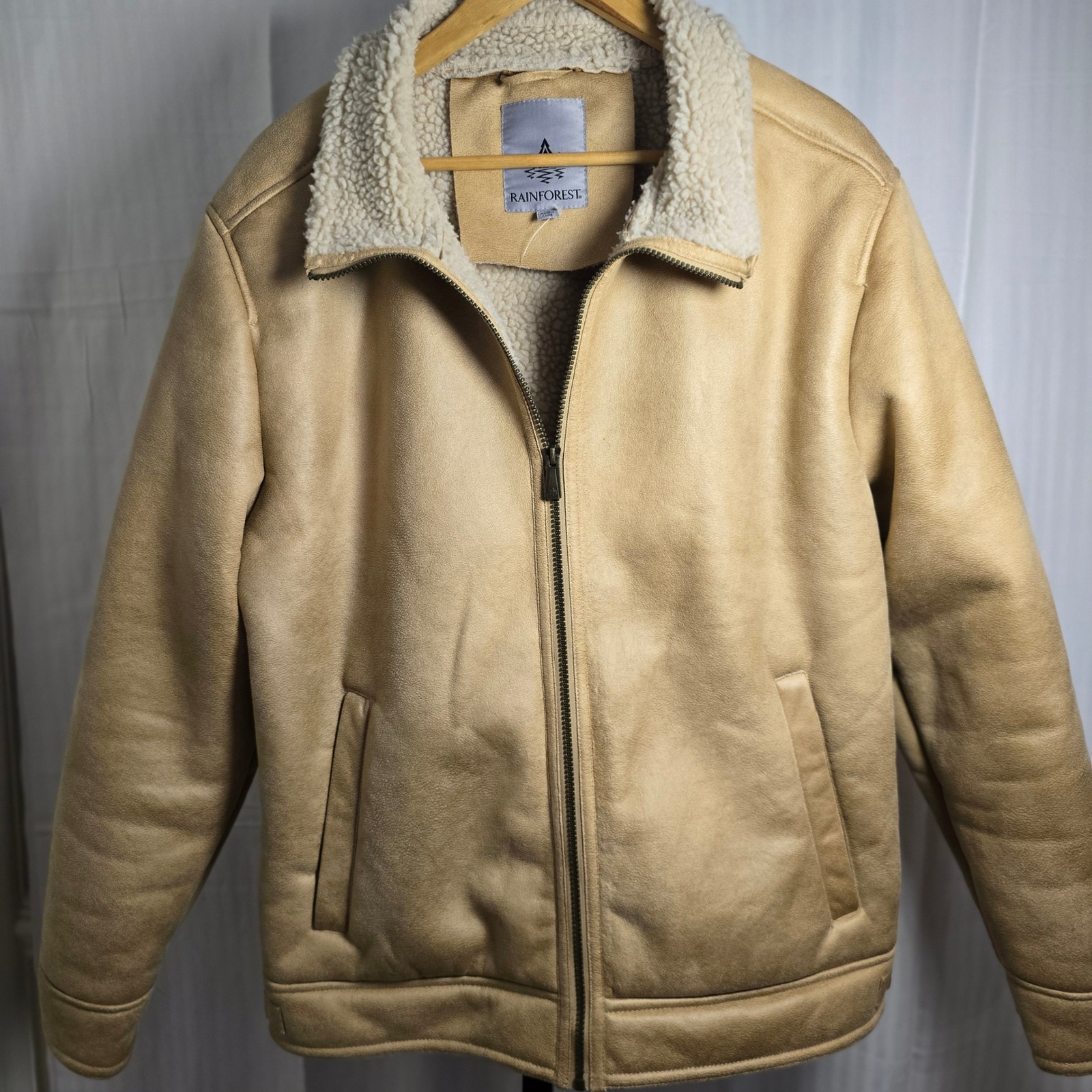 Keywords: Mens jacket, Rainforest, Faux leather jacket, Sherpa collar, Tan jacket, XL jacket, Casual jacket, Winter jacket, Fall jacket, Mens coat, Sherpa jacket, Fleece lined, Full zip, Outerwear