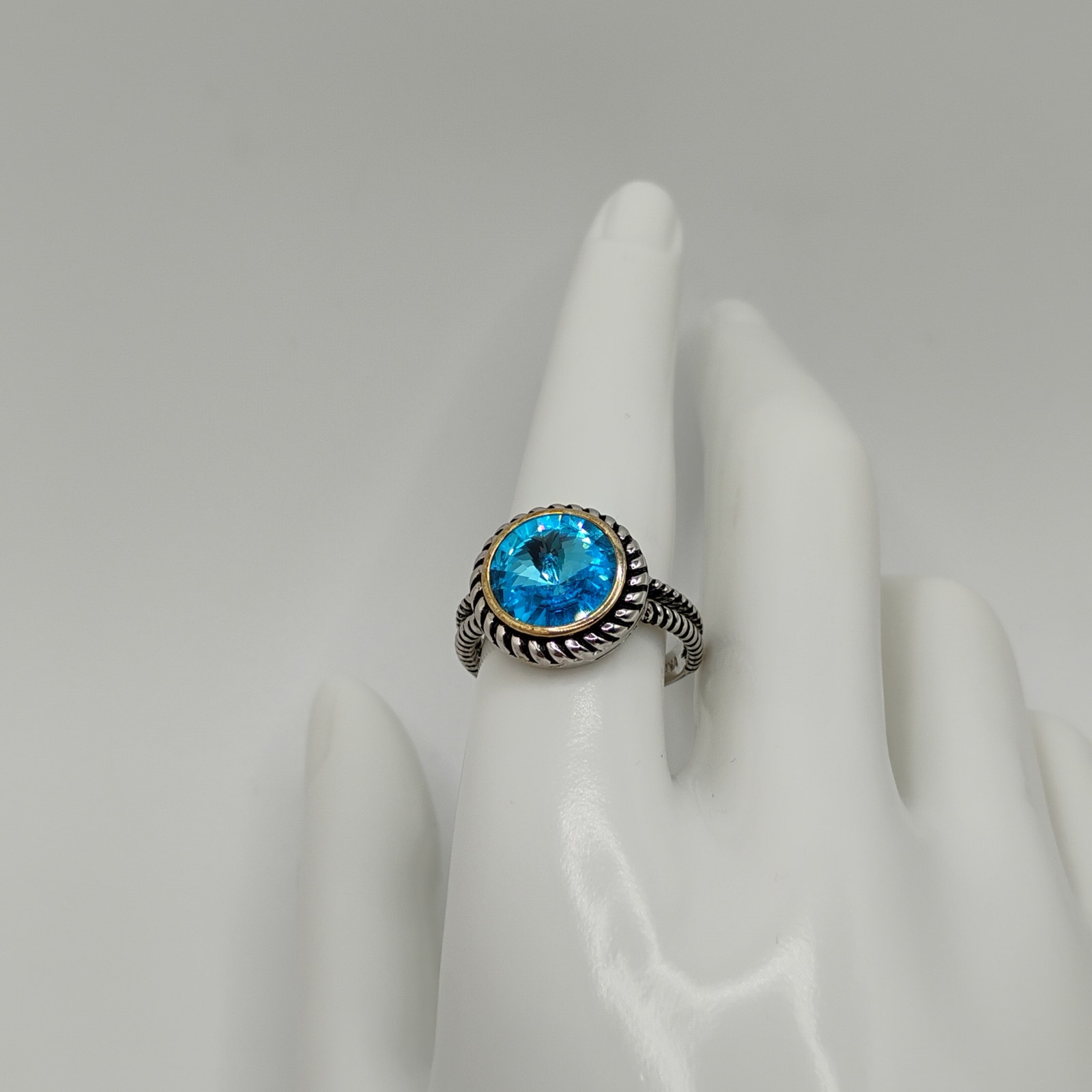 The product is a stunning reverse cut Blue Cubic Zirconia and Sterling Silver ring, designed in size 9. Signed FD 925, this ring features a single blue gemstone set in a high-quality silver band. The elegant design and vibrant blue color make it a versatile and fashionable accessory to add to any jewelry collection.