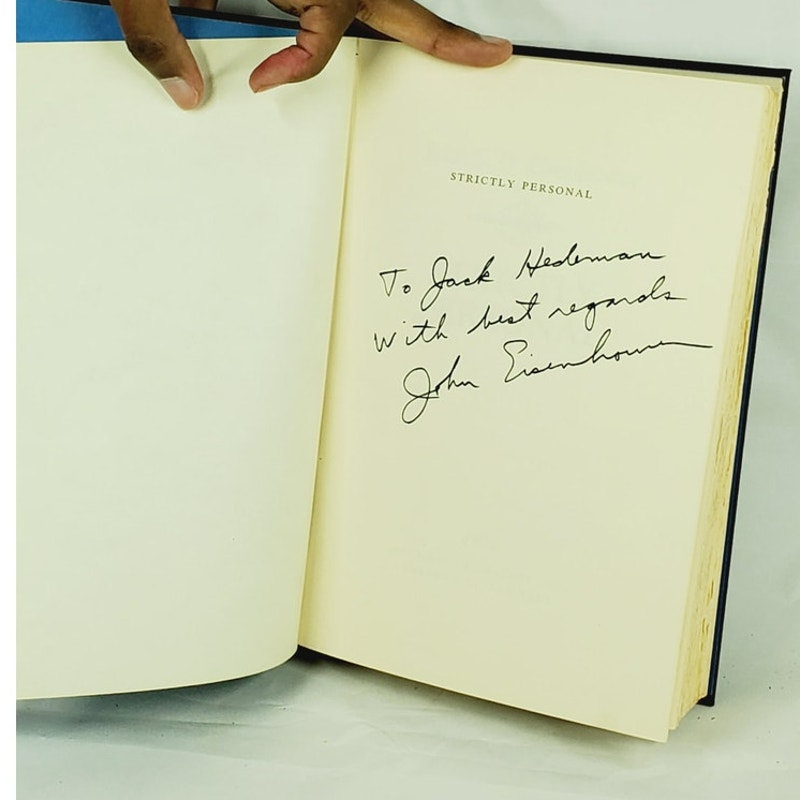 This is a rare signed first edition copy of Strictly Personal by John S. D. Eisenhower, published in 1974 by Doubleday. The book includes a personal inscription and signature from John Eisenhower, making it a unique collector’s item.